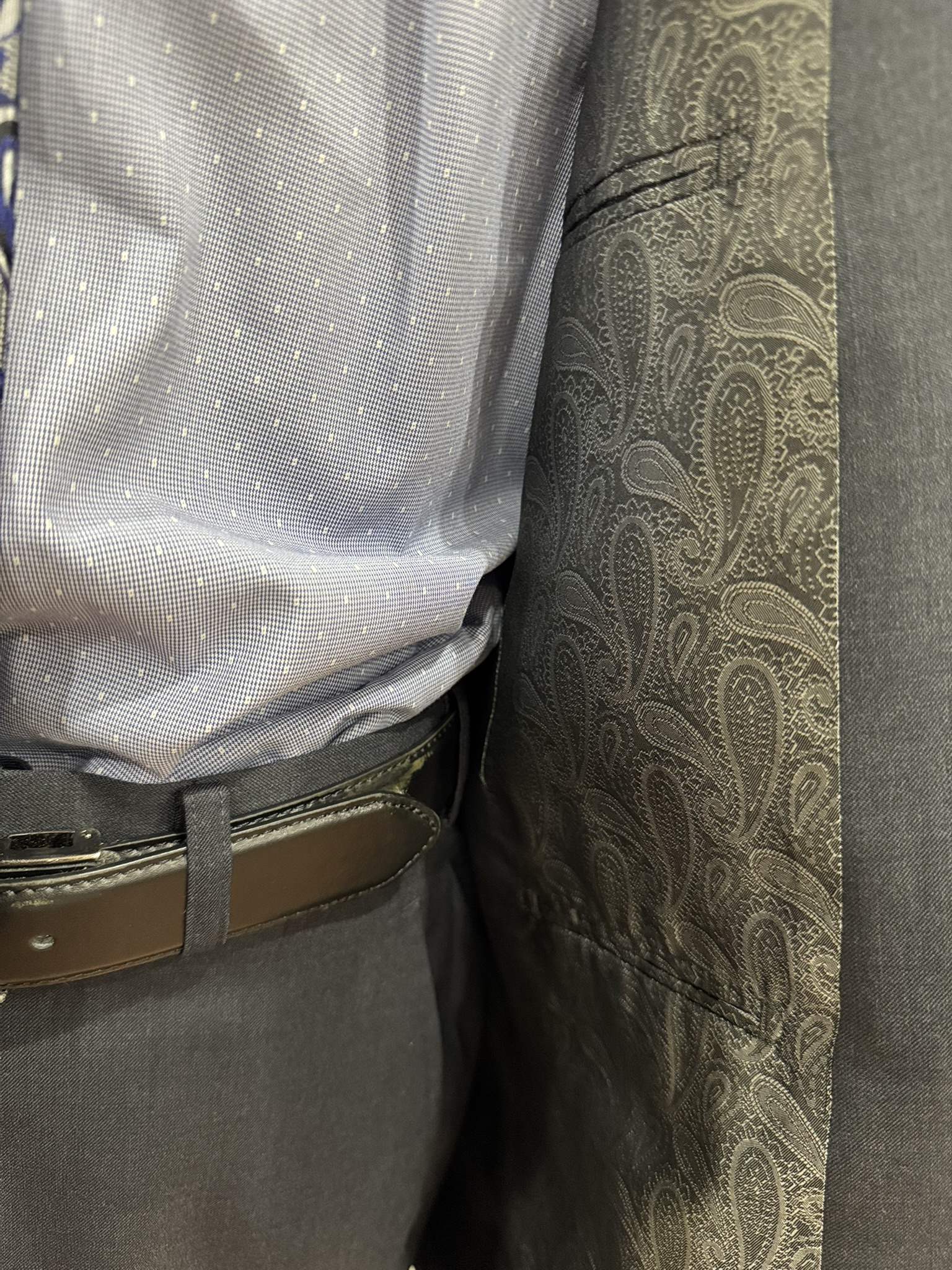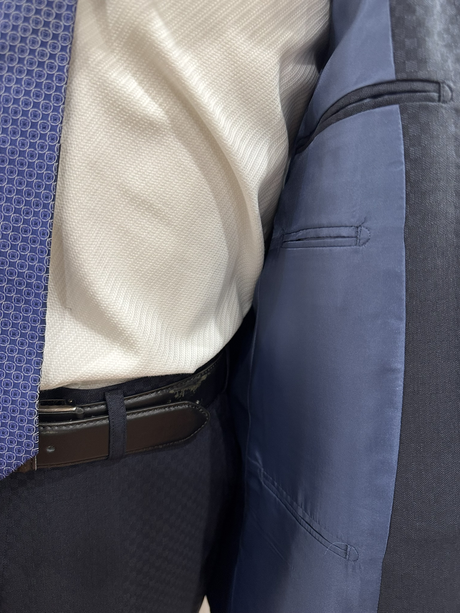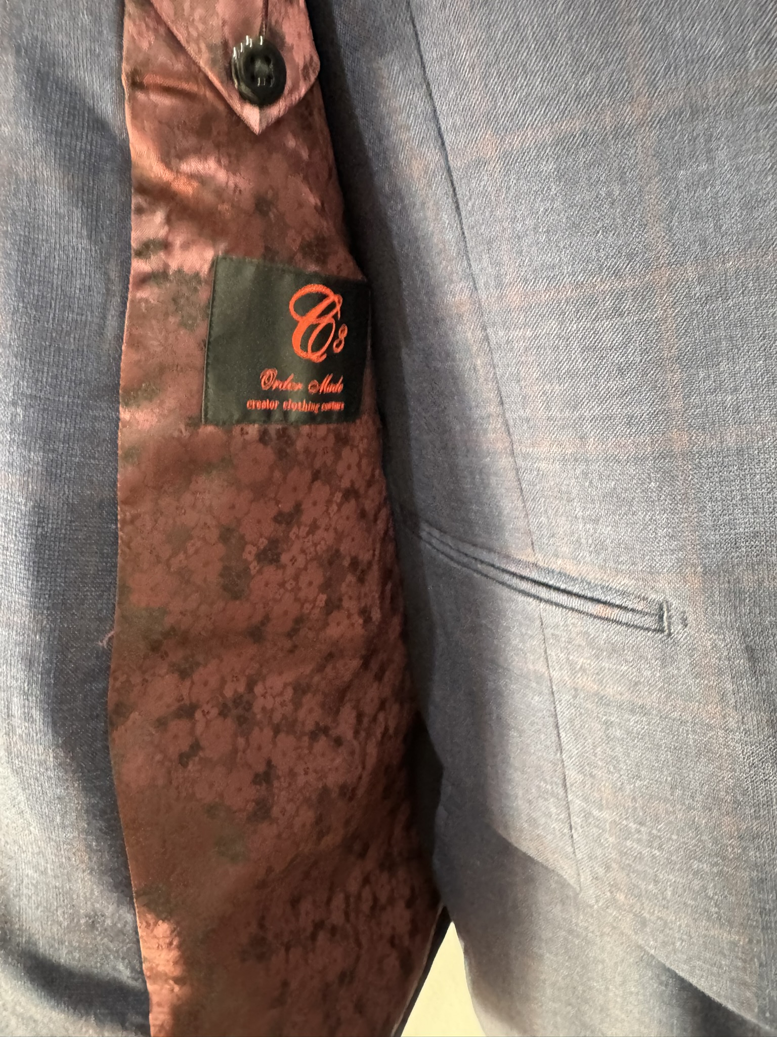 裏地をパープルの花柄でお作りし、胸ポケットは裏地生地を使ってチーフ