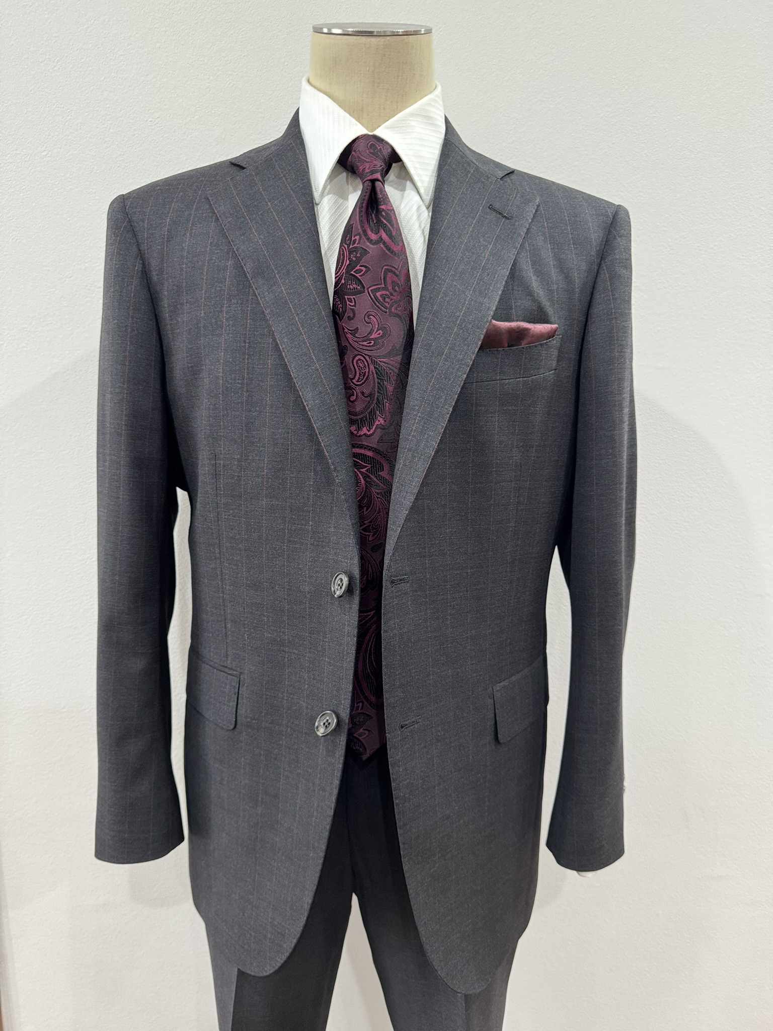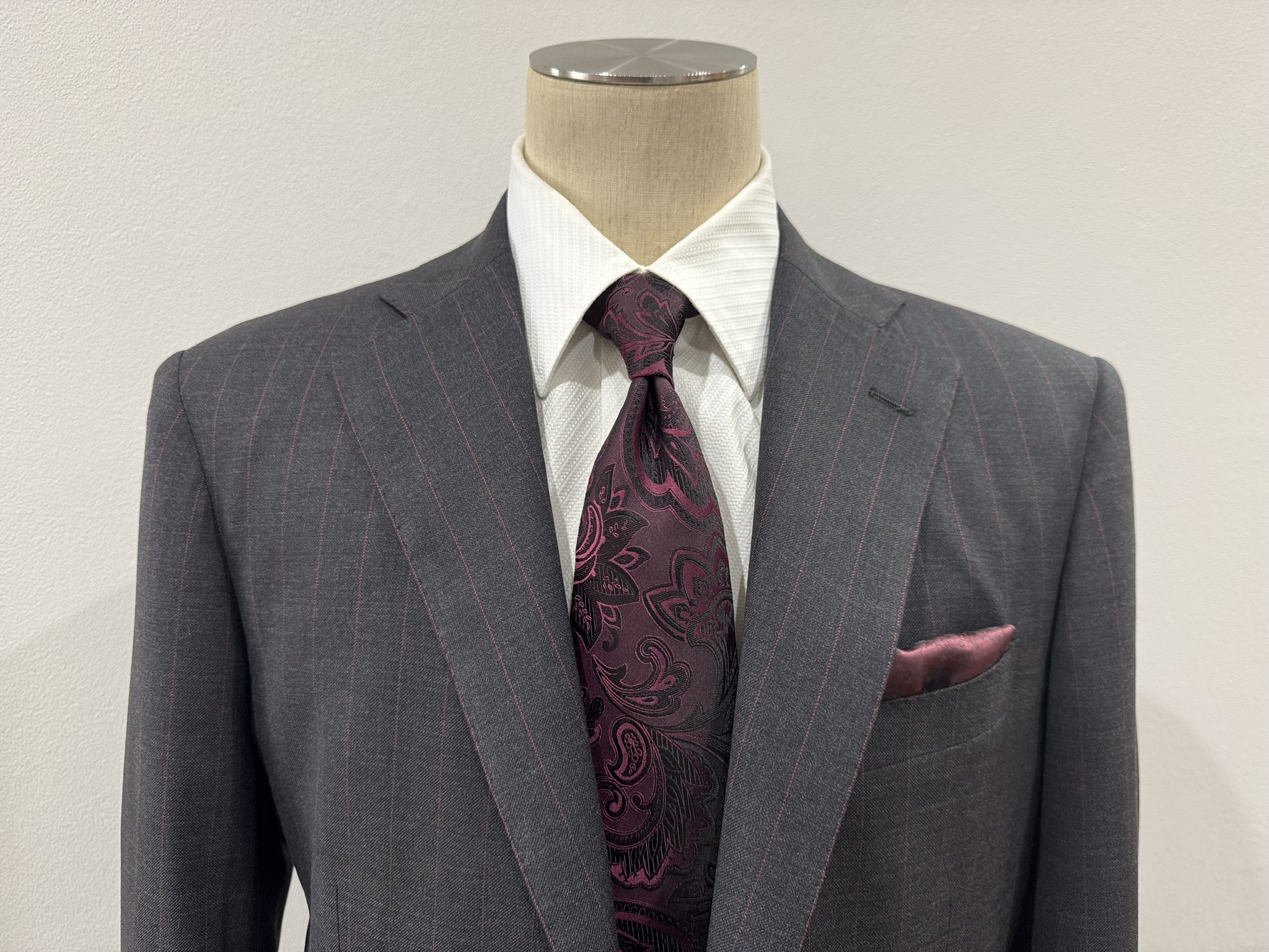 お仕事着にも、式やパーティなどの際のスーツにも良しなスーツです。